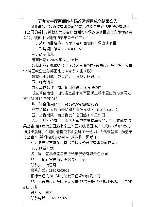 五龍宴會(huì)廳西側(cè)停車場(chǎng)改造項(xiàng)目成交結(jié)果公告