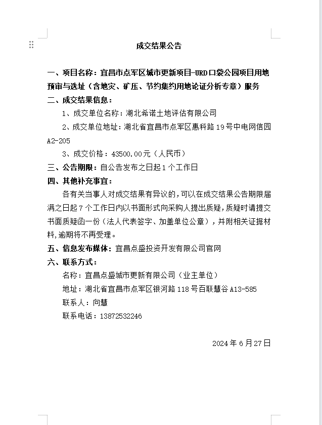 宜昌市點軍區(qū)城市更新項目-URD口袋公園項目用地預審與選址(含地災、礦壓、節(jié)約集約用地論證分析專章)服務 成交公告