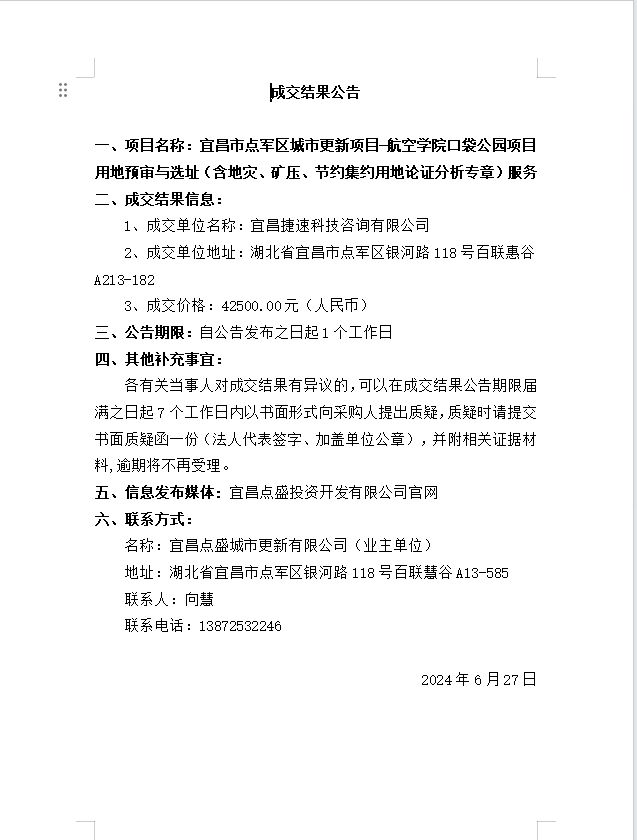 宜昌市點軍區(qū)城市更新項目-航空學(xué)院口袋公園項目用地預(yù)審與選址(含地災(zāi)、礦壓、節(jié)約集約用地論證分析專章)服務(wù) 成交公告